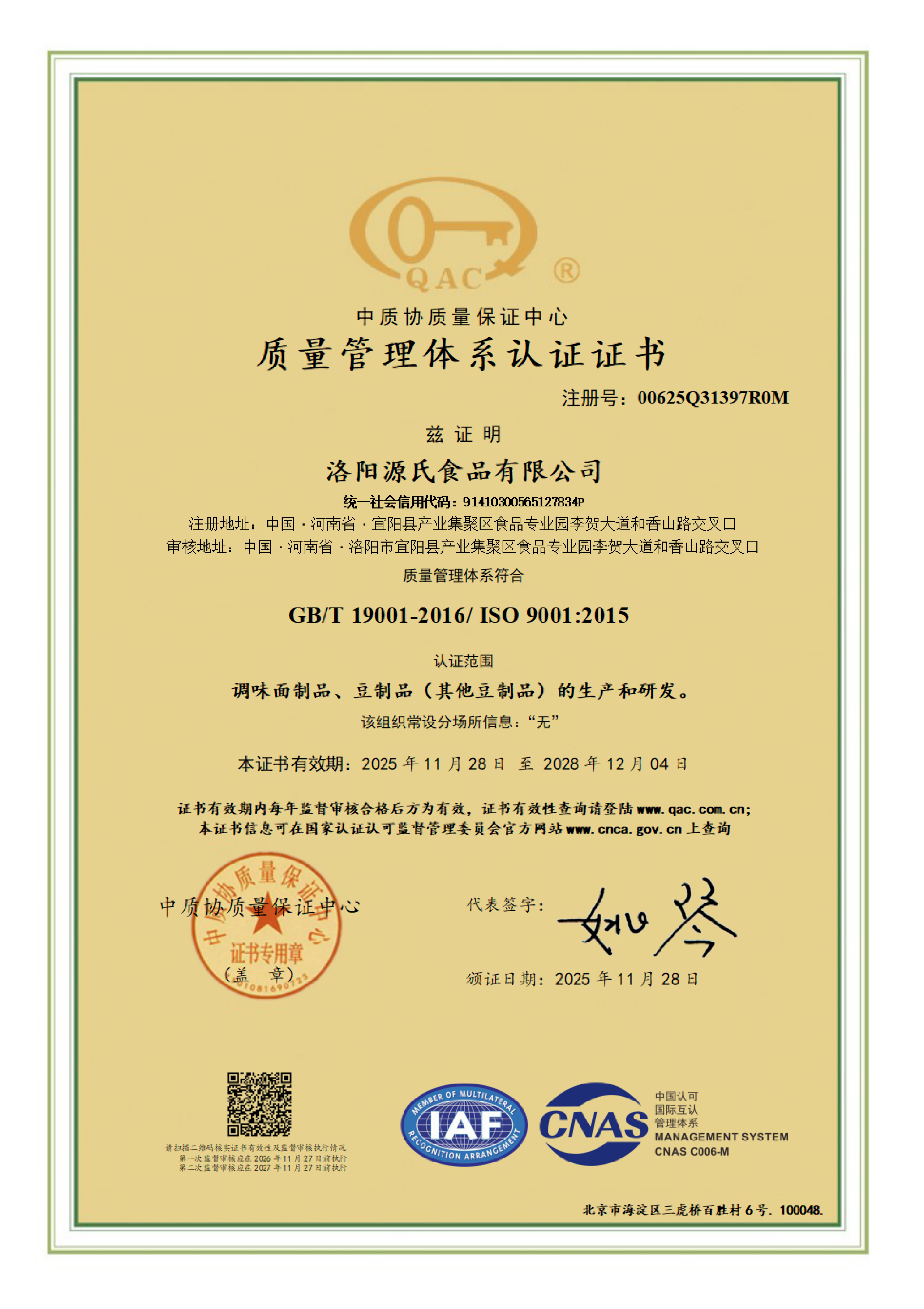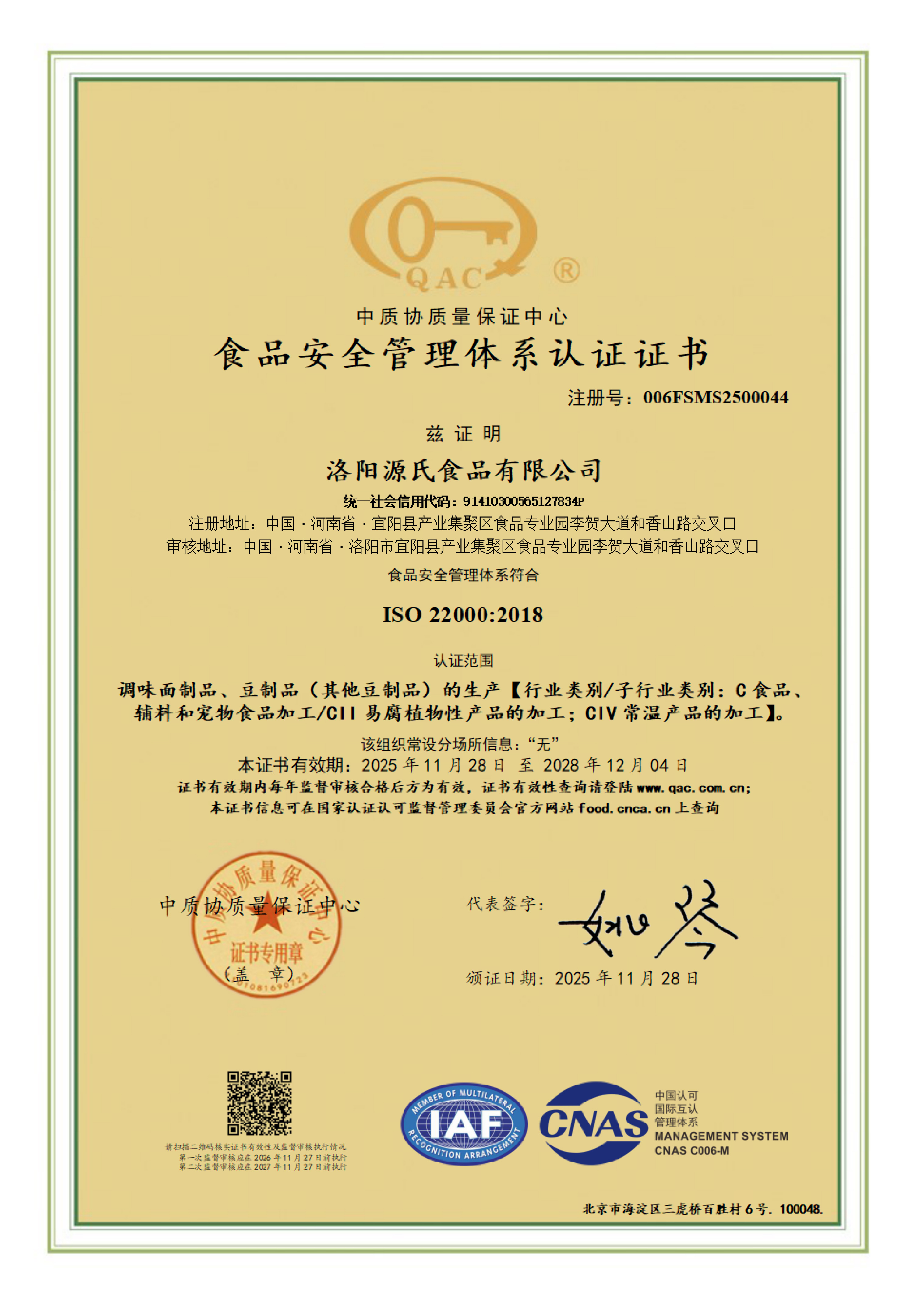 食品安全管理体系认证证书