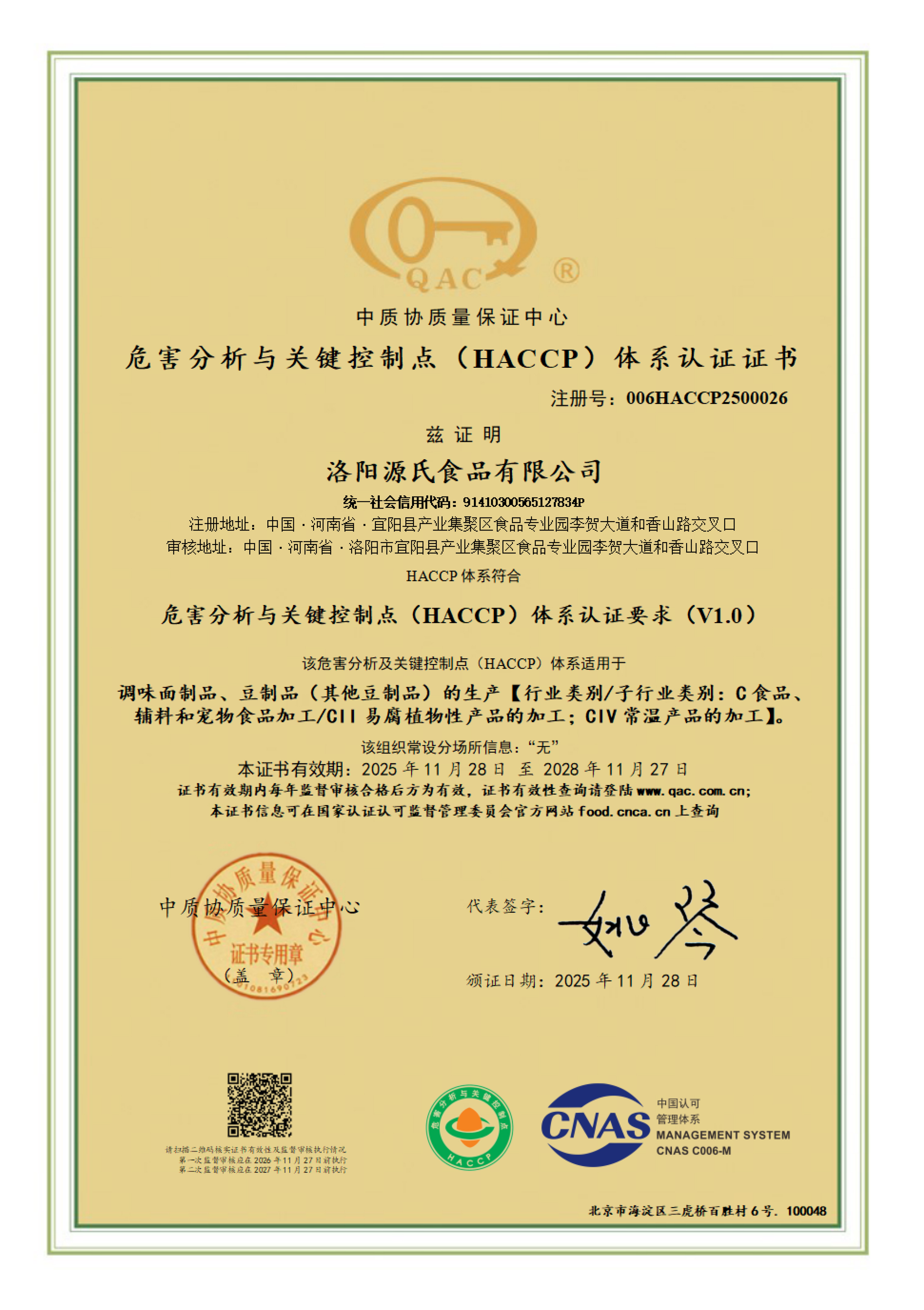 危害分析与关键控制点(HACCP)体系认证证书